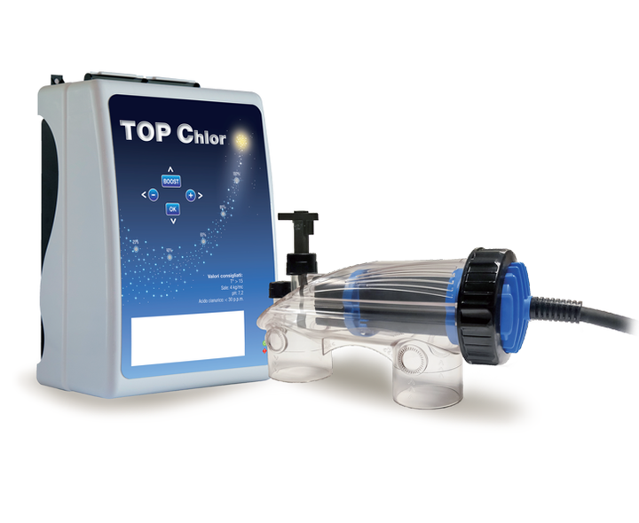 Salzelektrolysegerät für die private Schwimmbadpflege. Durch den Einsatz des Top Chlor und gleichzeitiger Salzbeimengung ins Pool wird ein elektrochemischer Vorgang in Gang gesetzt, welcher eine natürliche und effektive Desinfektion des Schwimmbadwasser bewirkt.